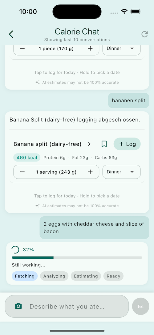 Calorie Chat turns rough meal descriptions into structured items you can review, adjust, and log with calories and macros.