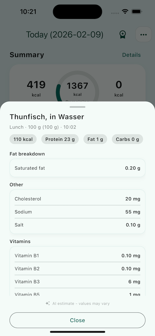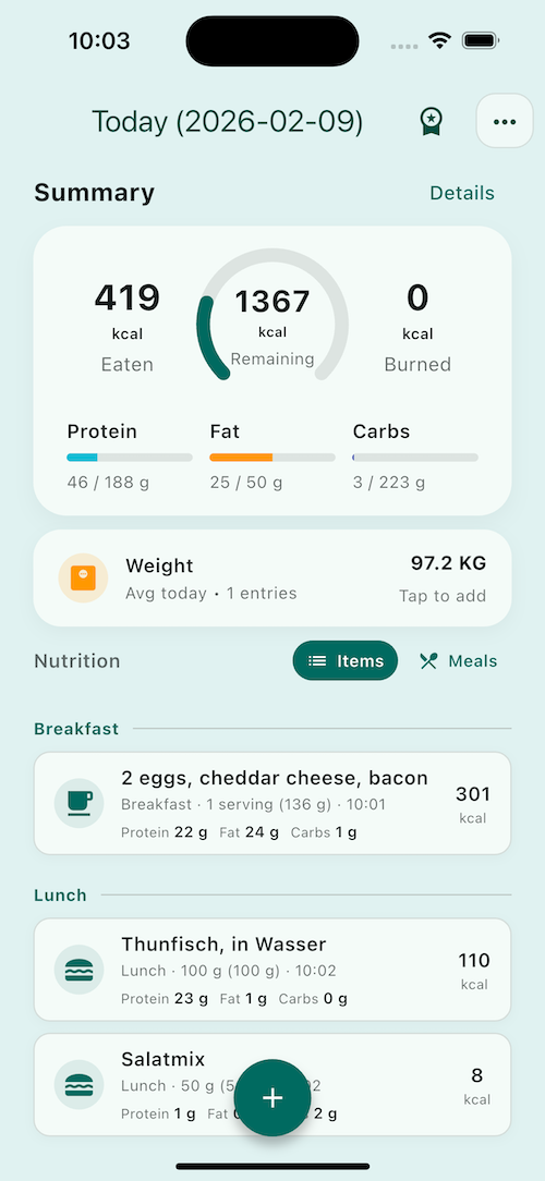 The app is designed around one thing: getting from “I ate this” to a useful logged day with as little typing and decision fatigue as possible, while still giving you a real calorie counter and macro tracker you can trust day to day.