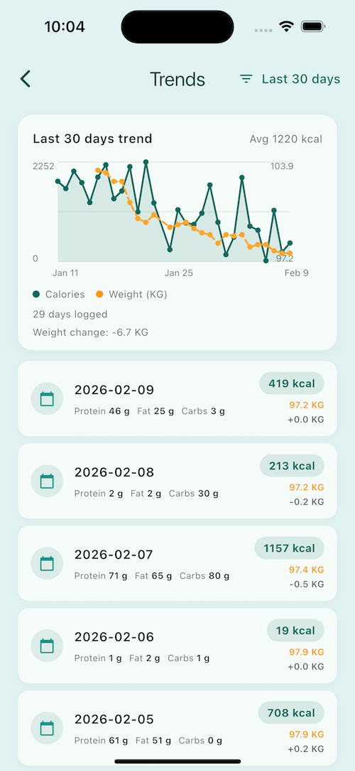 Weight and calorie trends stay visible without turning the app into a spreadsheet. You see progress, not just entries.