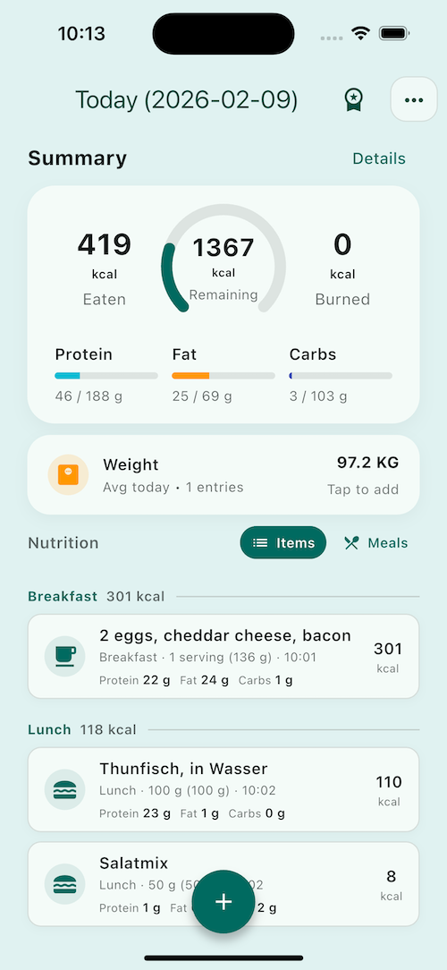 The app is designed around one thing: getting from “I ate this” to a useful logged day with as little typing and decision fatigue as possible, while still giving you a real calorie counter and macro tracker you can trust day to day.
