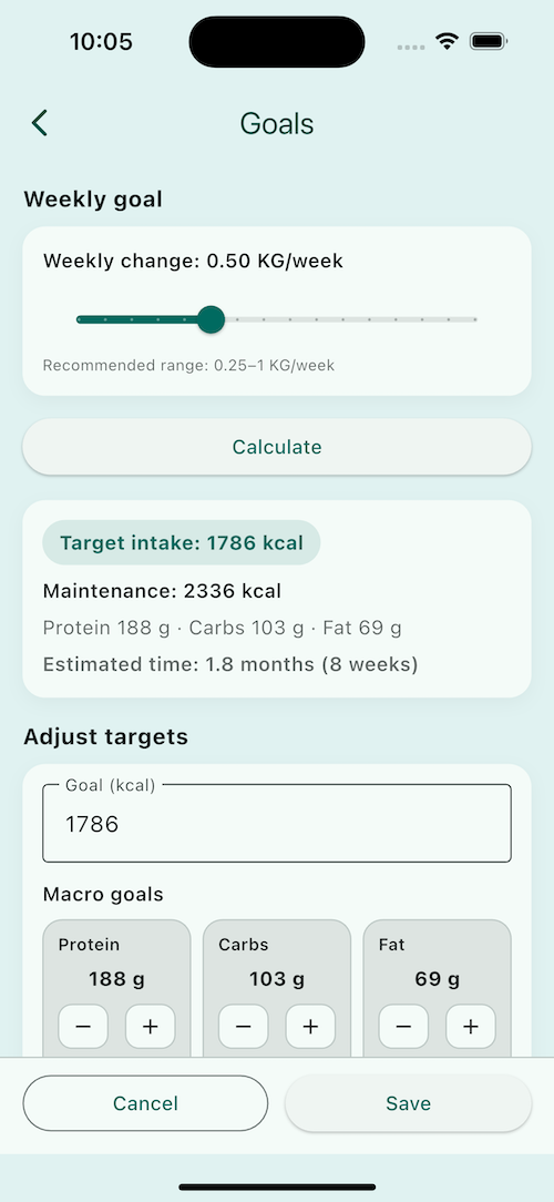 Weight and calorie trends stay visible without turning the app into a spreadsheet. You see progress, not just entries.